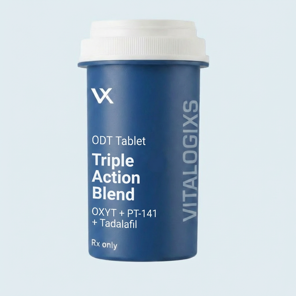 Active ingredients: Tadalafil 10 mg for improved blood flow and erections, PT-141 2000 mcg to enhance libido, and oxytocin 100 IU